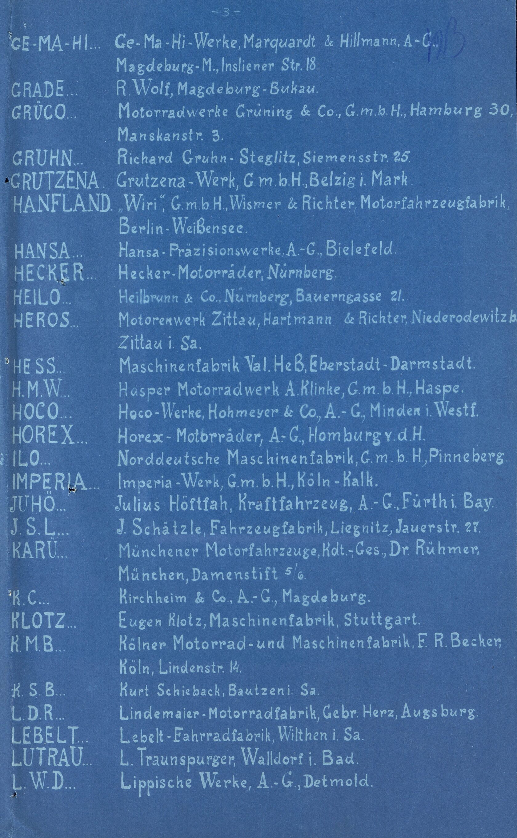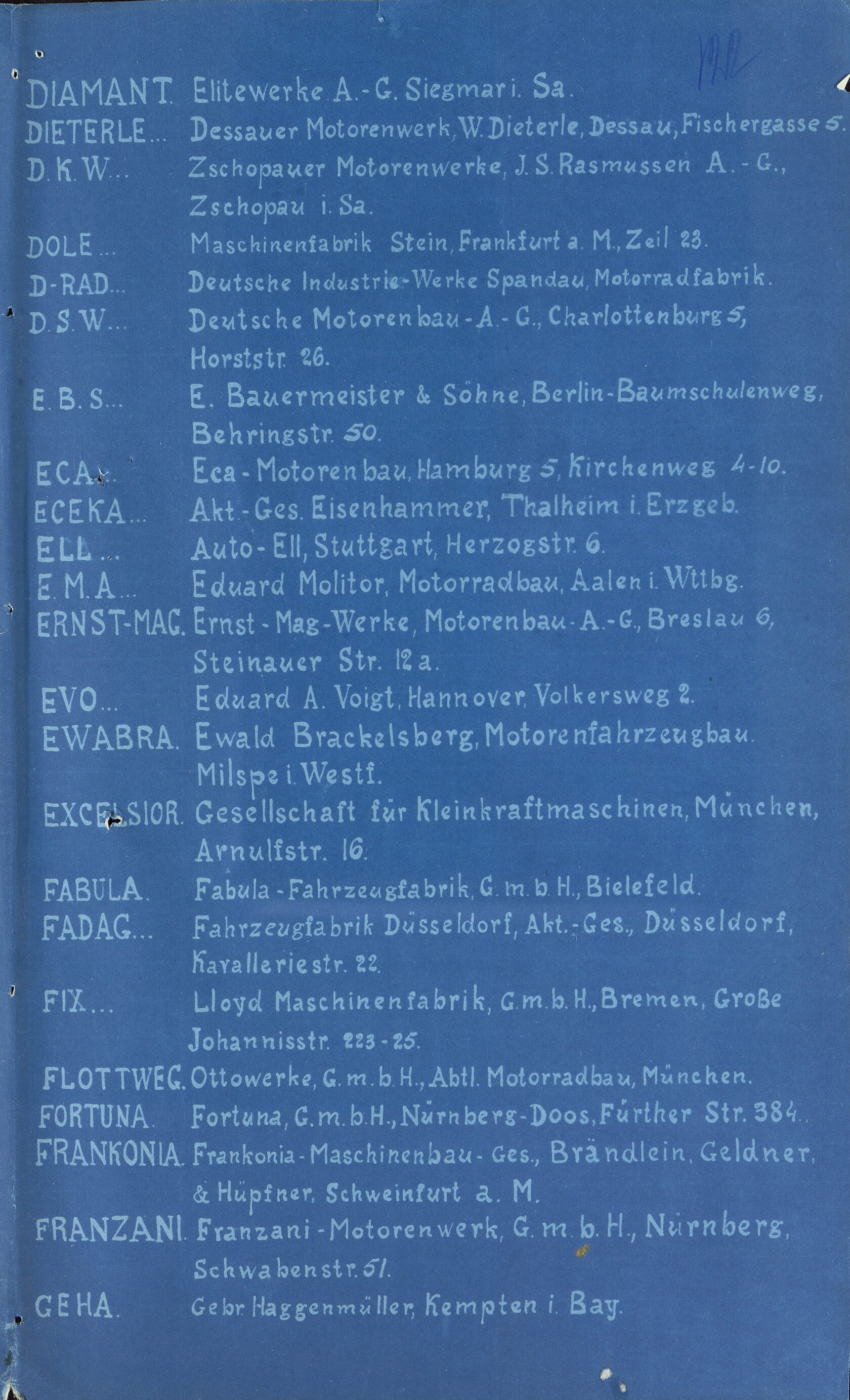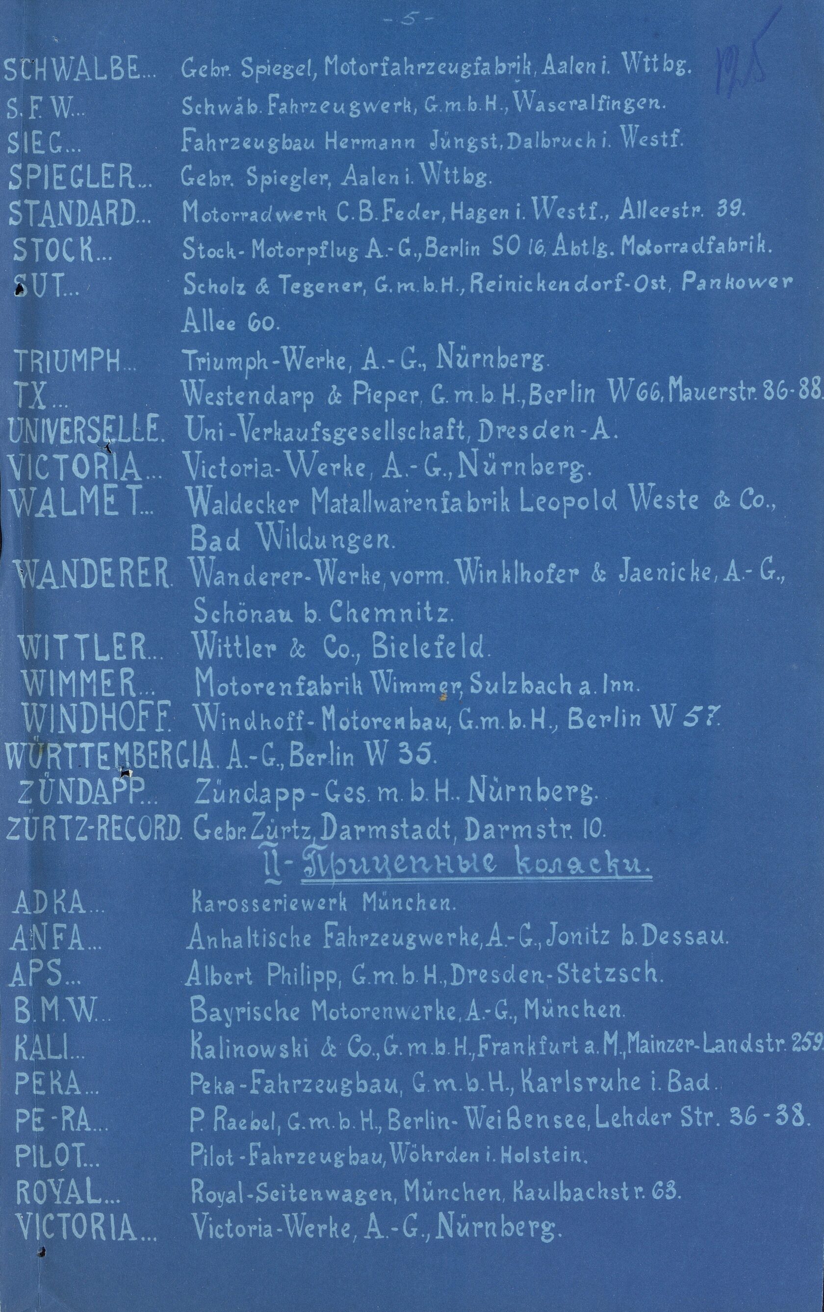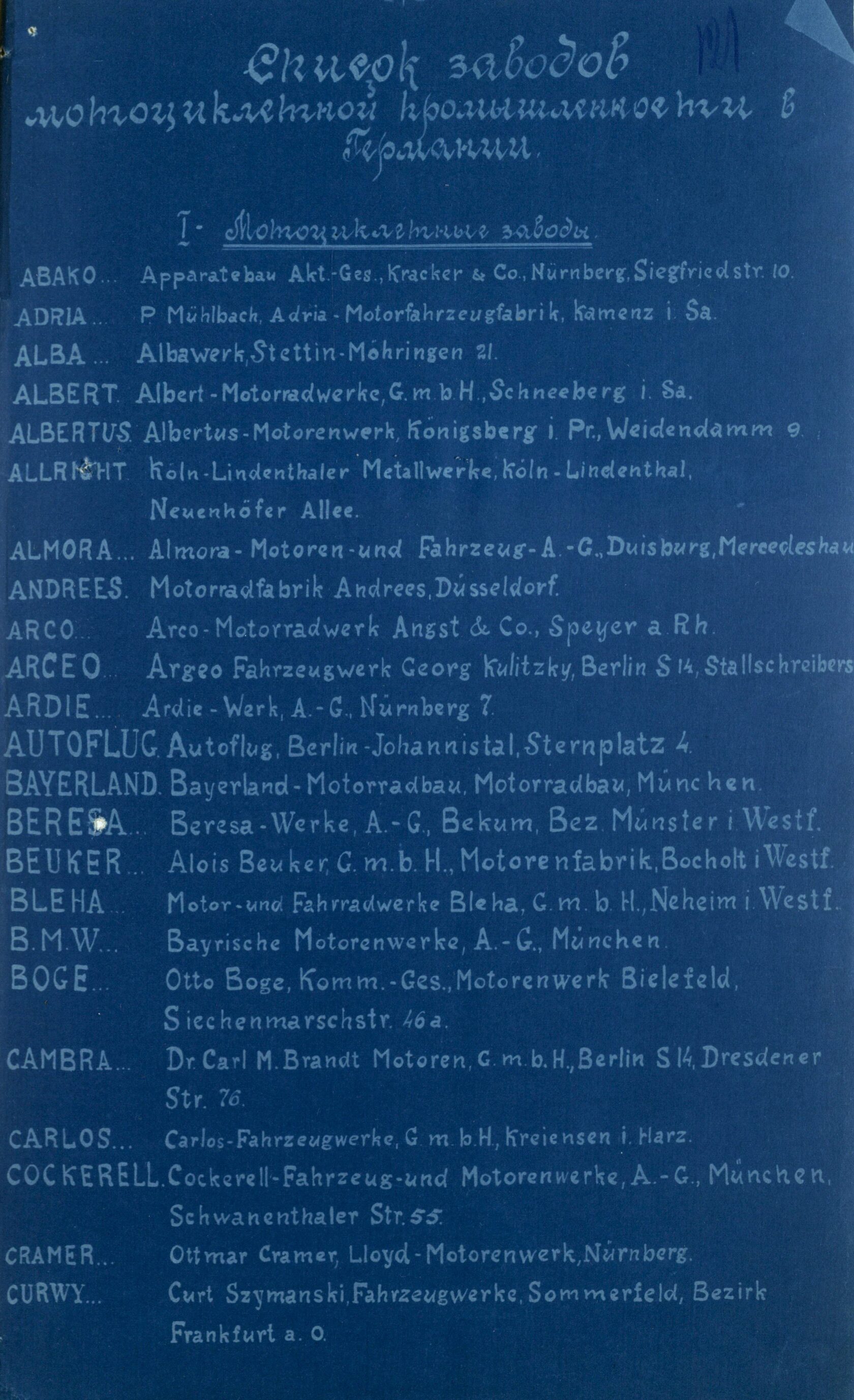 Список заводов Германии, специализирующихся на производстве мотоциклов и колясок. Приложение к докладу П.В. Можарова. 1928 г. ГКУ «ЦГА УР». Ф. Р-543. Оп. 15. Д. 435. Лл. 121-125.