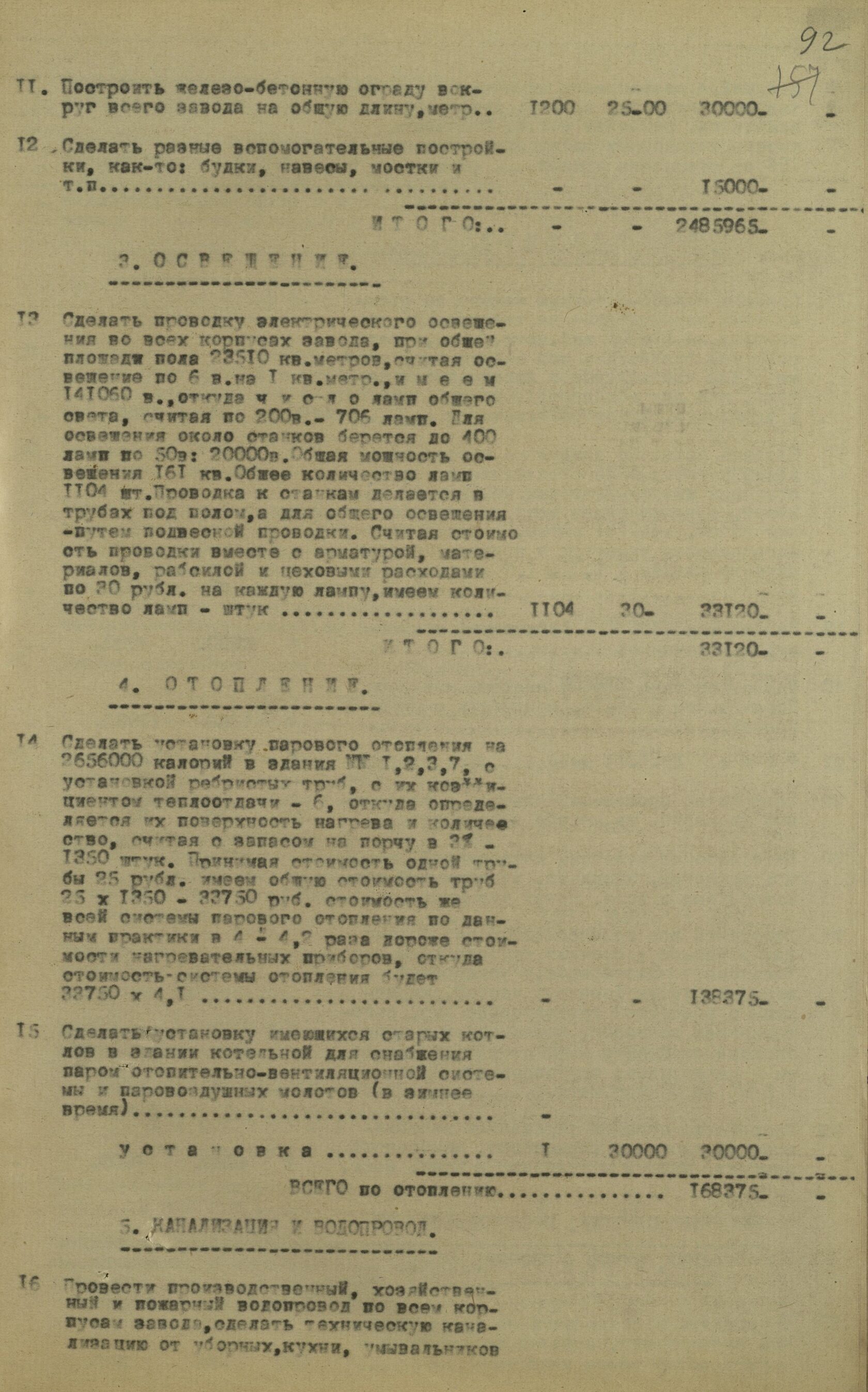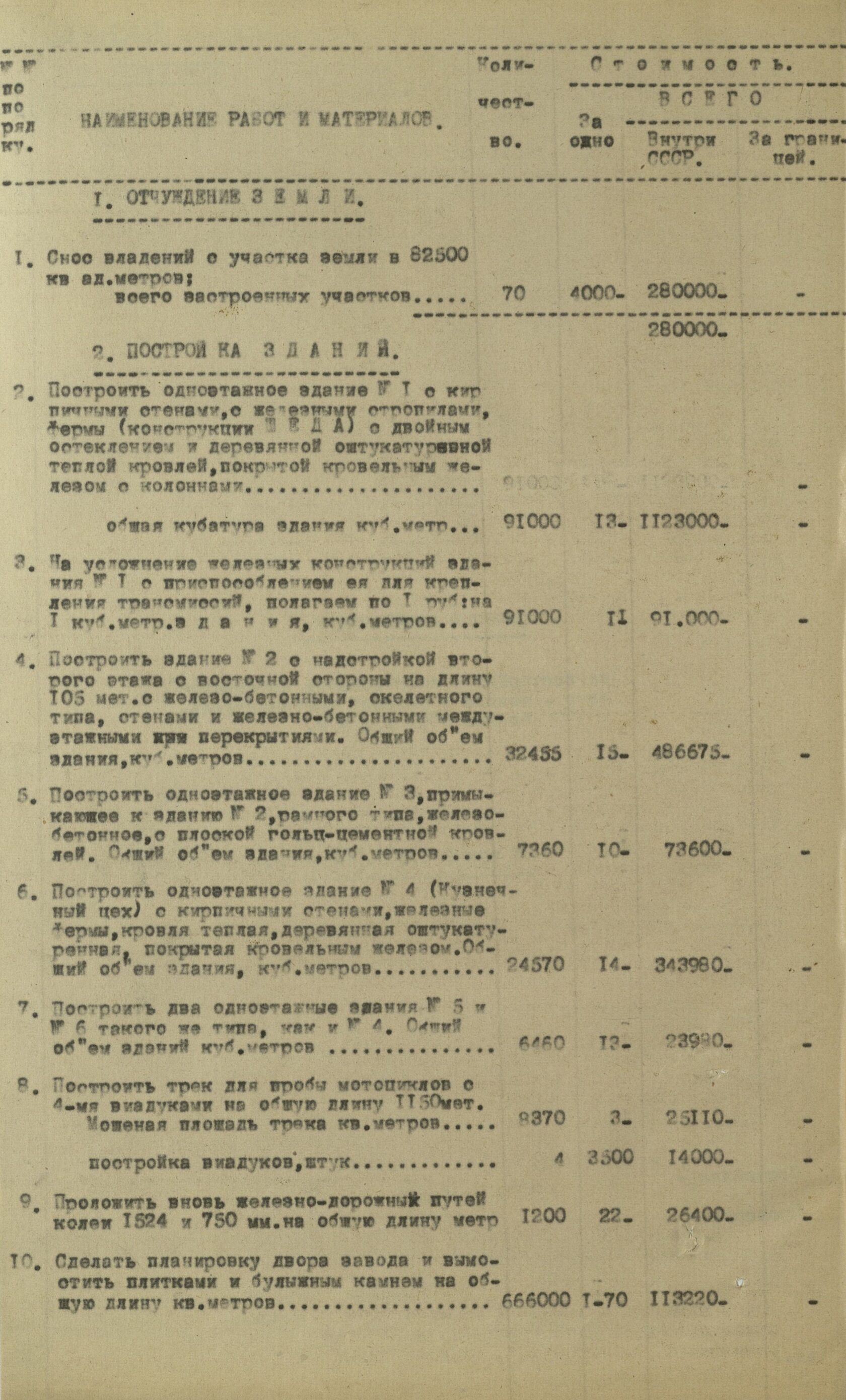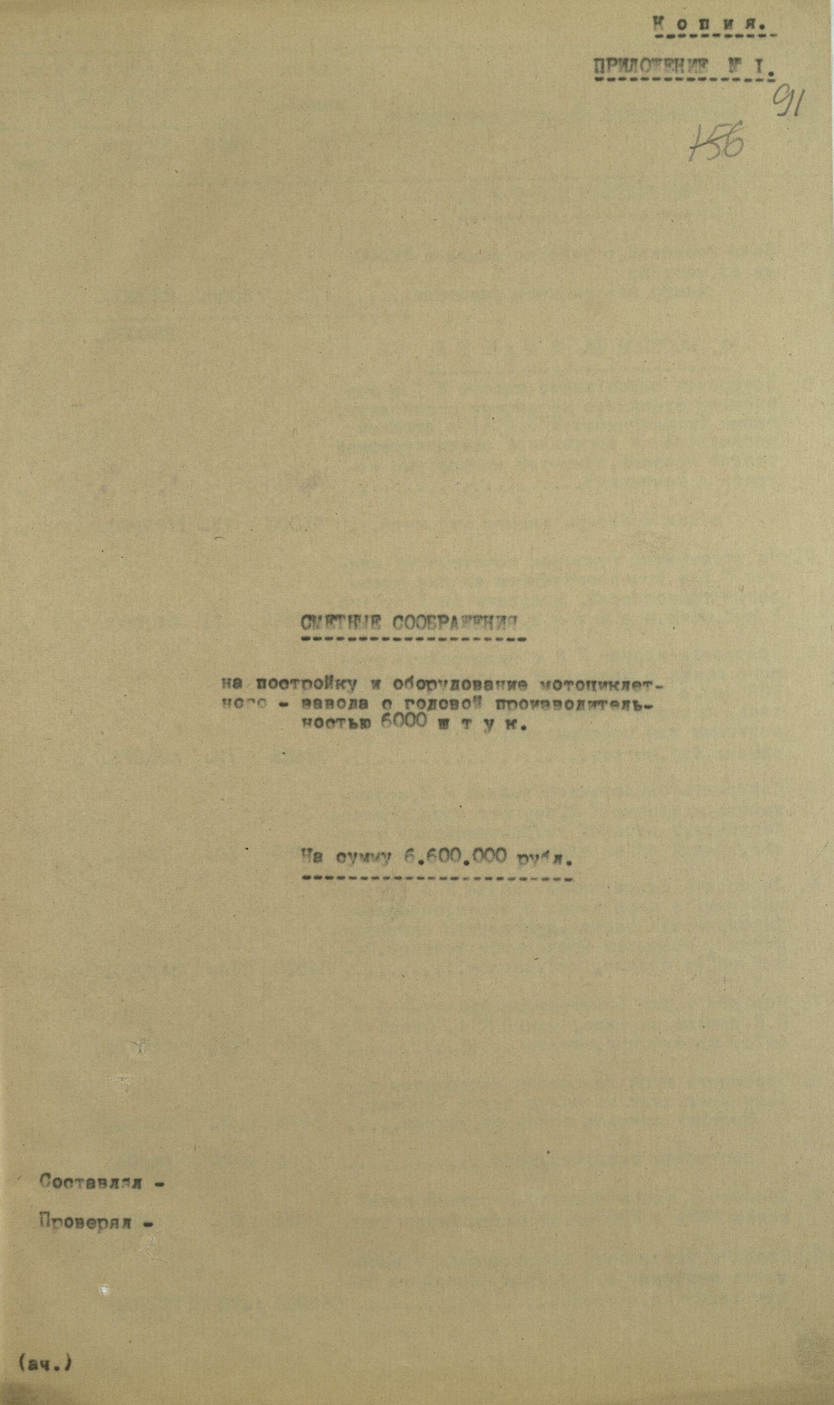 Сметные соображения на постройку мотоциклетного завода. 1928 г. ГКУ «ЦГА УР». Ф. Р-543. Оп. 15. Д. 542. Лл. 91-92.