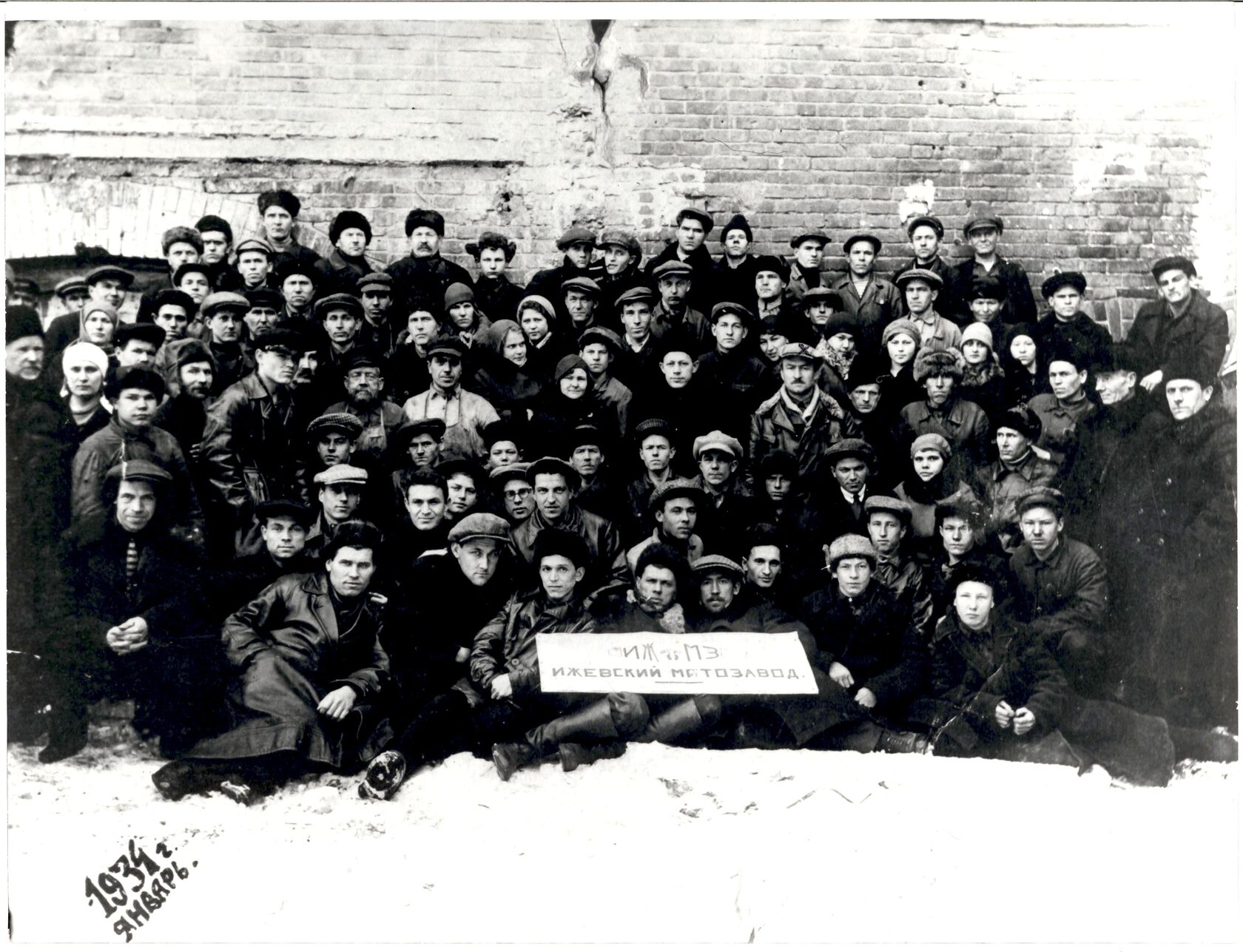 П.В. Можаров с коллективом рабочих Ижевского мотозавода. 1934 г. ГКУ «ЦГА УР». Ф. Р-1709. Оп. 1. Д. 61.